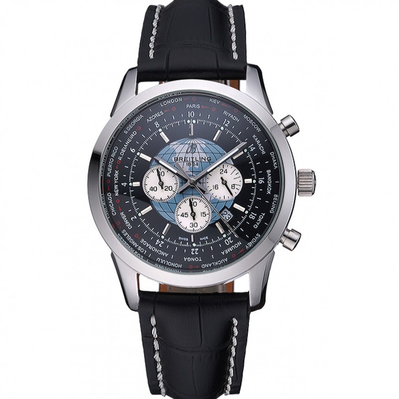 Breitling Transocean Chronograph Unitime cadran noir Bracelet en cuir noir Boîtier en acier inoxydable 622242