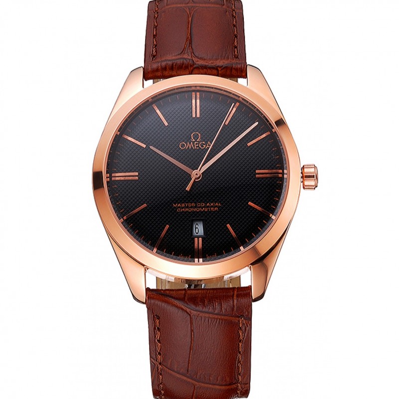 Pas Cher Omega Tresor Maître Co-Axial cadran noir boîtier en or rose bracelet en cuir brun
