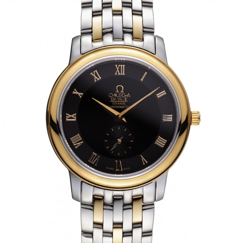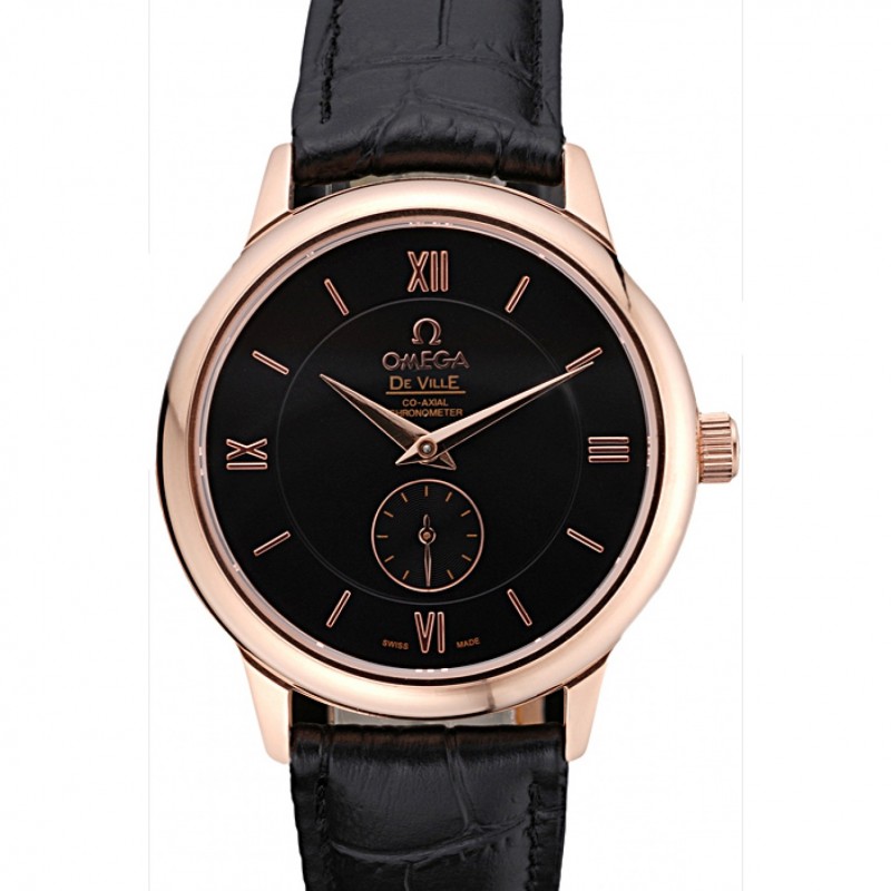 Pas Cher Omega DeVille Prestige petites secondes Cadran Noir boîtier en or noir Bracelet en cuir 622602