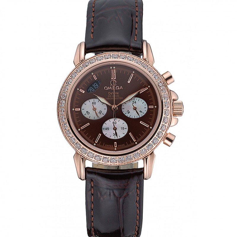 Pas Cher Replique Montre Omega De Ville Chronographe cadran brun boîtier en or diamant brun Bracelet en cuir 622457