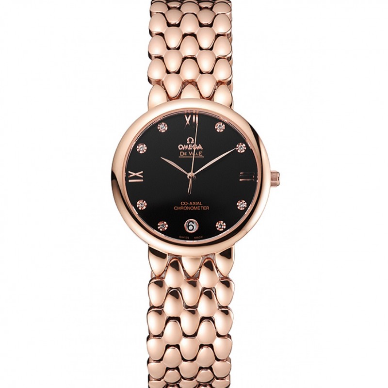 SS Replique Montre Omega De Ville Prestige Cadran noir avec des diamants boîtier en or rose et bracelet