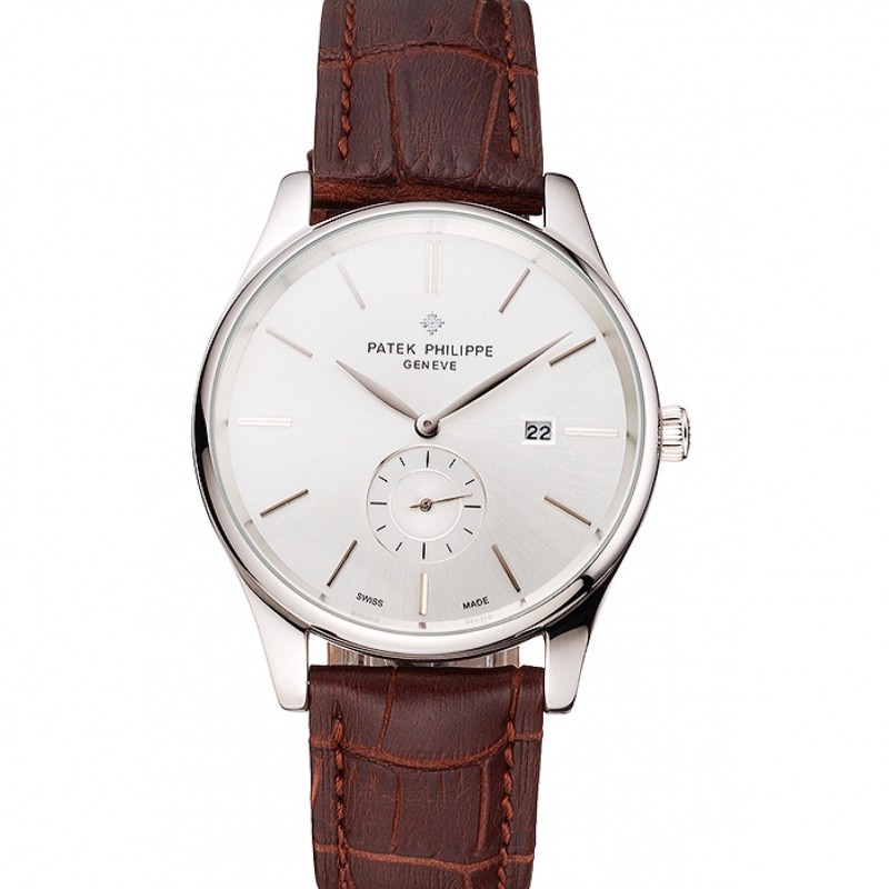 Patek Philippe Calatrava date cadran argenté Boîtier en acier inoxydable bracelet en cuir brun