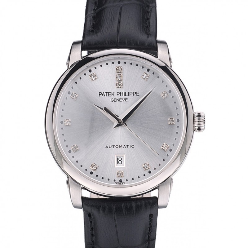 Pas Cher Replique Montre Patek Philippe Calatrava suisse poli Lunette cadran gris bracelet en cuir noir 7659