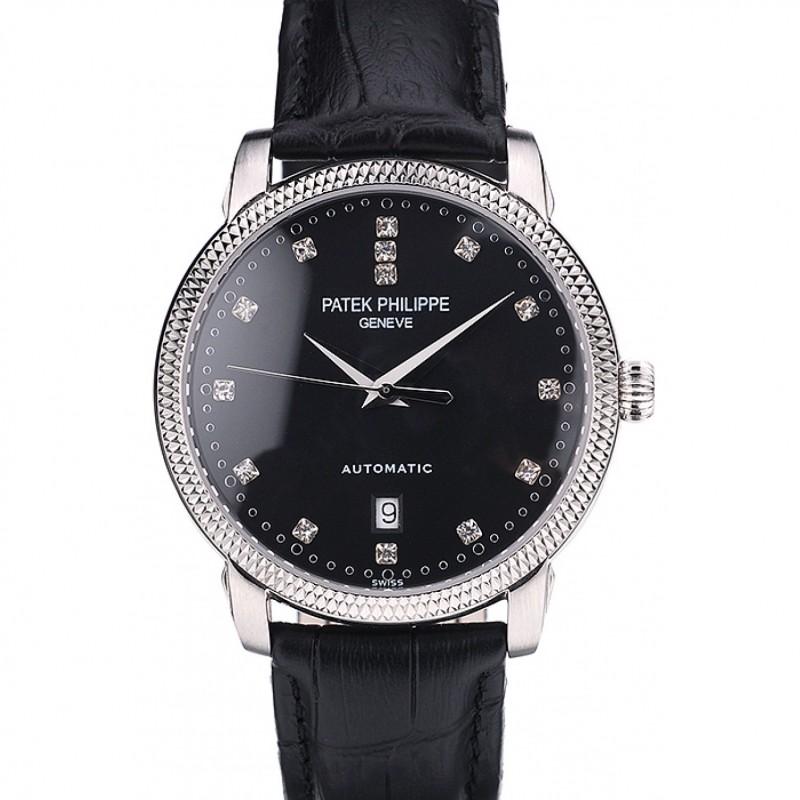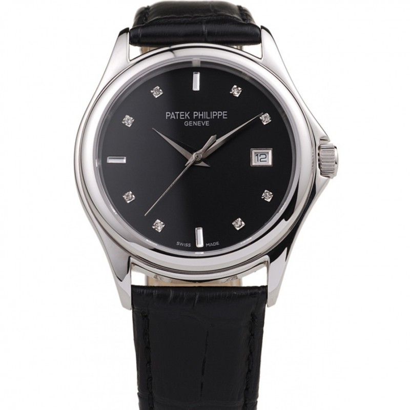 Patek Philippe Calatrava Geneve cristal constellée Heure Marker cadran noir bracelet en cuir noir 98170