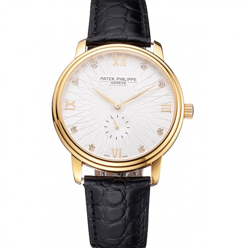 SS Replique Montre Patek Philippe Calatrava Blanc Cadran gaufrée boîtier en or Bracelet en cuir noir