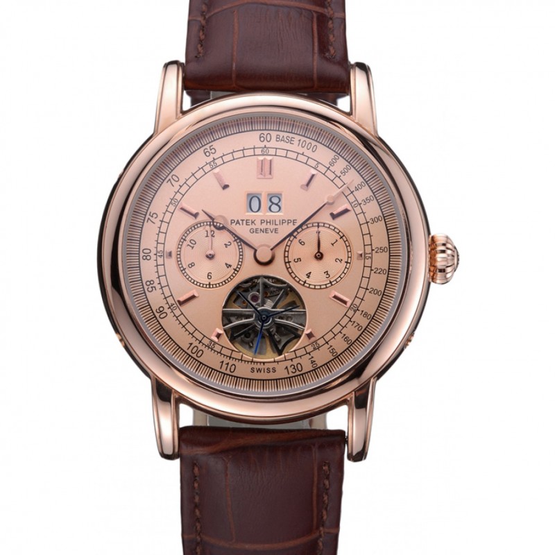 Haute qualité Patek Philippe Grand Complications Moonphase Calendrier perpétuel Tourbillon Or Rose Et Cadran bracelet en cuir brun