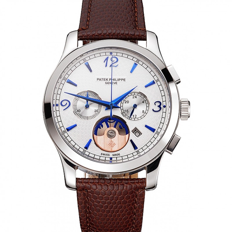 Patek Philippe Chronographe blanc Cadran guilloché bleu mains boîtier en acier inoxydable bracelet en cuir brun