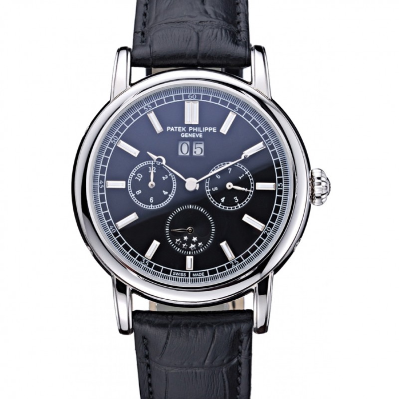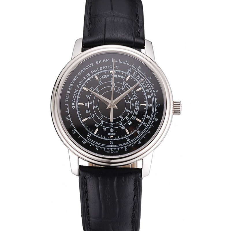 Suisse Patek Philippe multi-échelle chronographe cadran noir Boîtier en acier inoxydable Bracelet en cuir noir