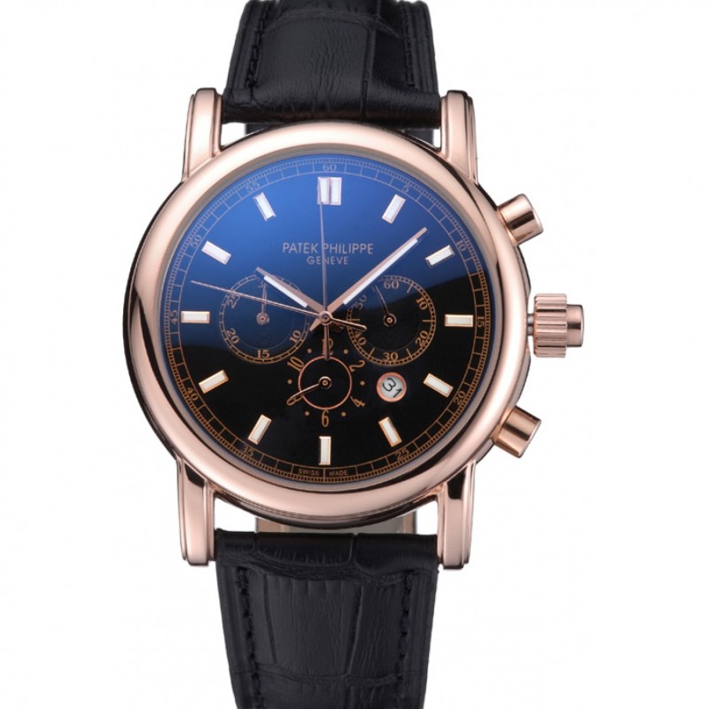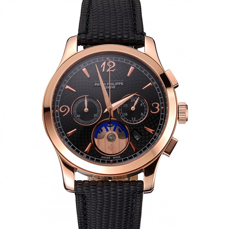 Meilleur Replique Montre Patek Philippe Chronographe guilloché cadran noir boîtier en or rose Bracelet en cuir noir