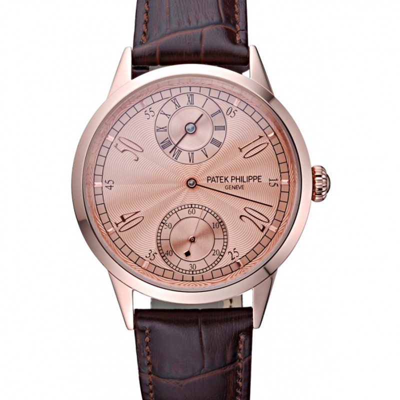 Luxe Replique Montre Patek Philippe Geneve Deux Cadran Rose Cadran lunette en or rose Brown bracelet en cuir 622149