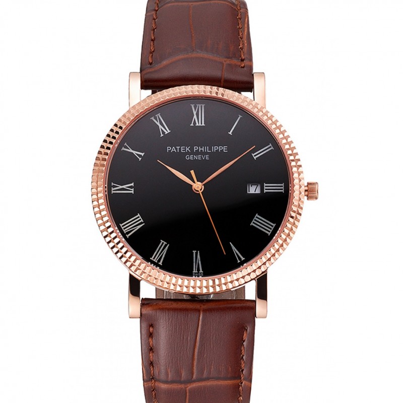 Luxe Replique Montre Patek Philippe Calatrava cadran noir chiffres romains nervuré Lunette or rose bracelet en cuir brun