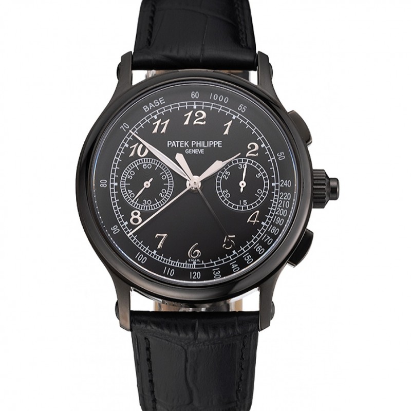 AAA Suisse Patek Philippe fendus secondes Chronographe Cadran Noir boîtier noir Bracelet en cuir noir