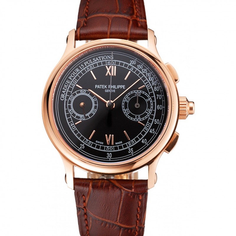 Luxe Replique Montre Suisse Patek Philippe 5170J Chronographe Cadran Noir Or Rose bracelet en cuir brun