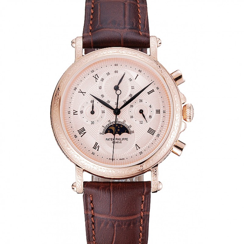 Haute qualité Patek Philippe Complications cas Chronographe cadran blanc or brun Bracelet en cuir 1454236