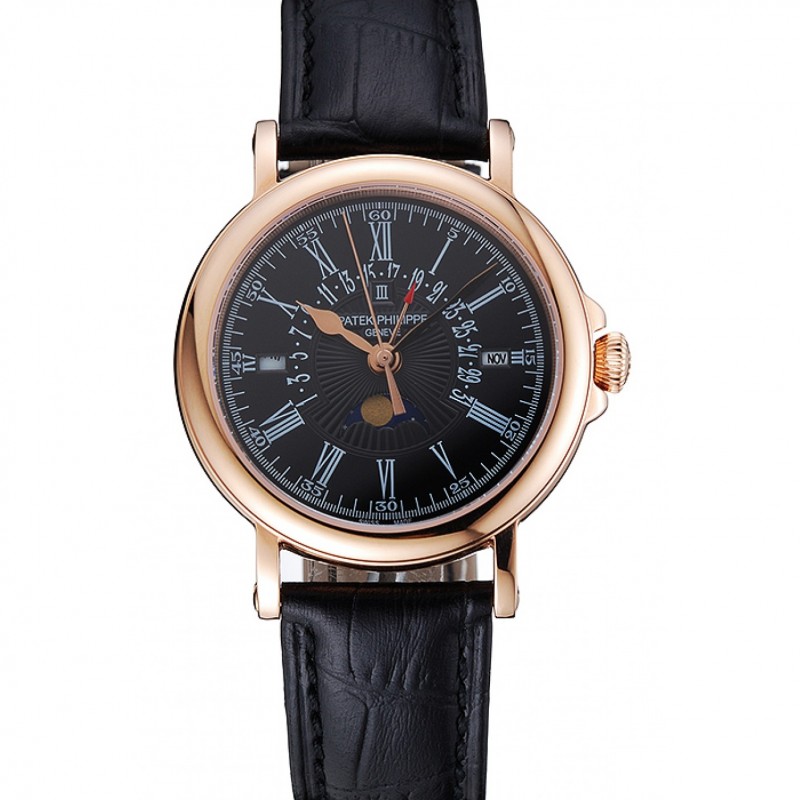 Patek Philippe Quantième Perpétuel Date Rétrograde Cadran Noir Bracelet en cuir noir boîtier en or rose 1454150