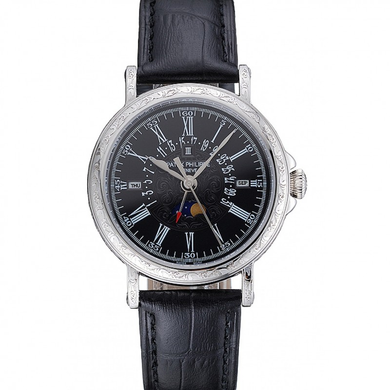 AAA Replique Montre Patek Philippe Quantième Perpétuel Date Rétrograde Cadran Noir Argent Gravé Caisse noire Bracelet en cuir 1454146