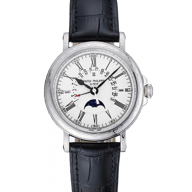 Pas Cher Replique Montre Patek Philippe Quantième Perpétuel Date Rétrograde Cadran Blanc Argent Gravé Caisse noire Bracelet en cuir 1454147