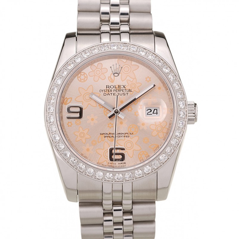 Luxe Replique Montre Rolex Datejust brossé Fleurs orange Boîtier en acier inoxydable Cadran diamants plaqué