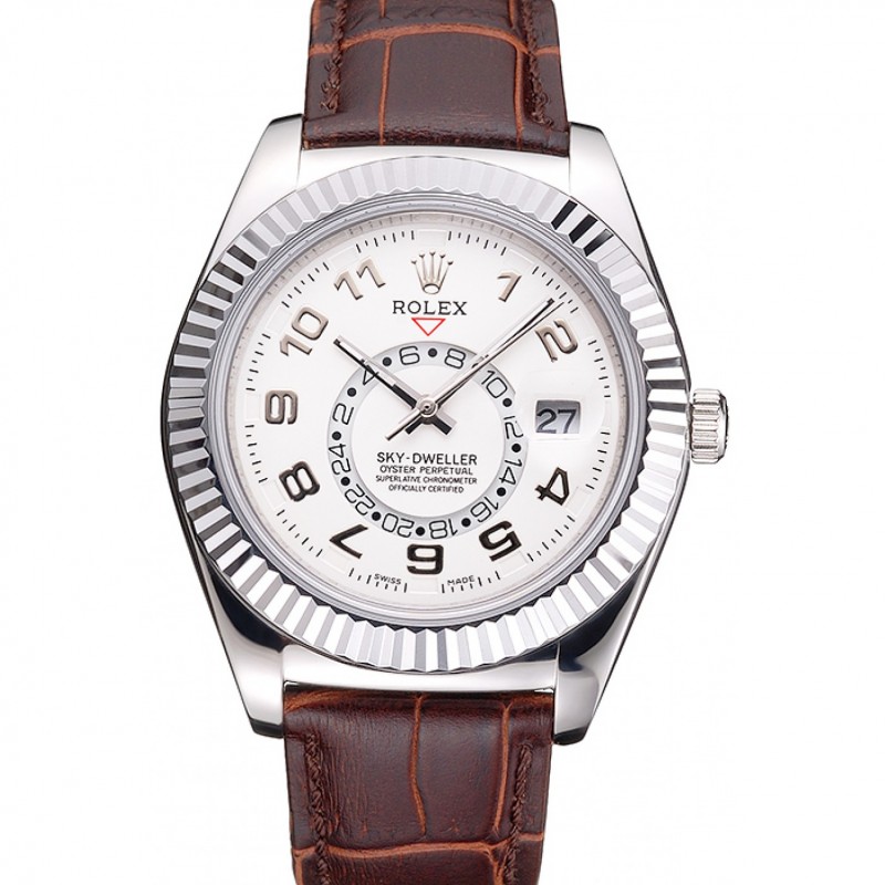 Rolex Sky Dweller cadran blanc Boîtier en acier inoxydable bracelet en cuir brun