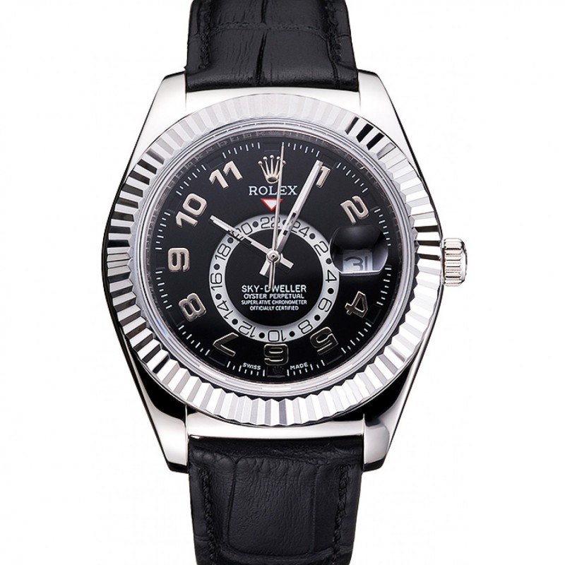Haute qualité Rolex Sky Dweller cadran noir Boîtier en acier inoxydable Bracelet en cuir noir