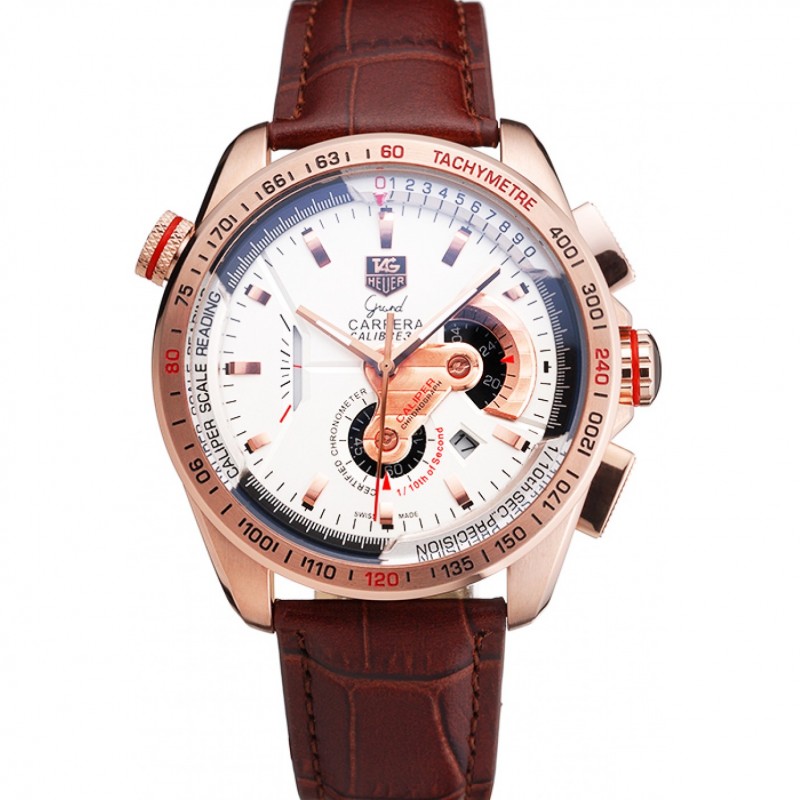 Pas Cher Tag Heuer Carrera cadran blanc boîtier en or rose bracelet en cuir brun 98244