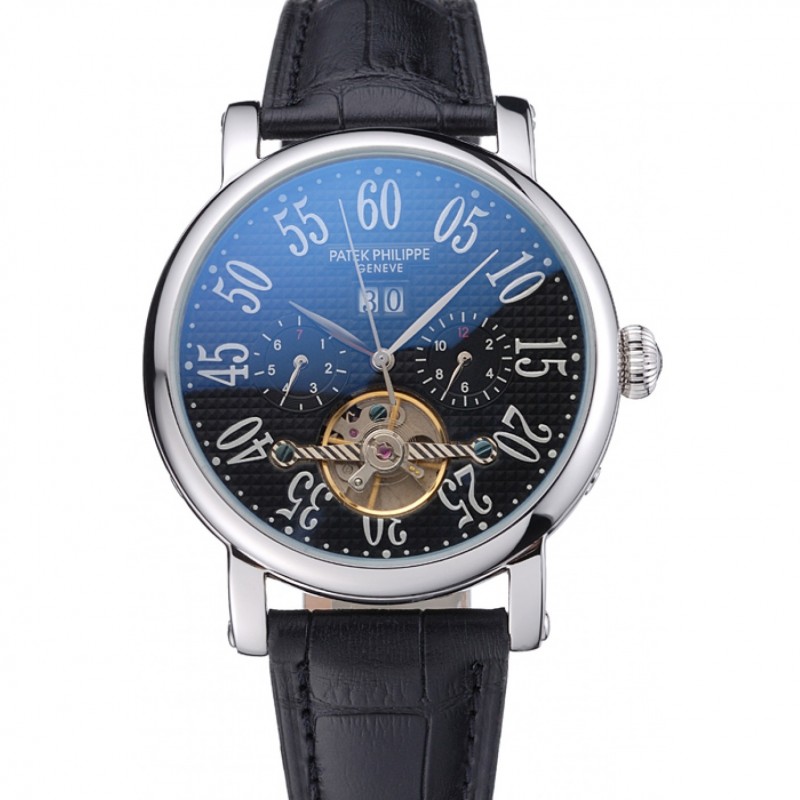 Meilleur Patek Philippe Day Date Tourbillon Cadran Noir Boîtier en acier inoxydable bracelet en cuir noir 622839