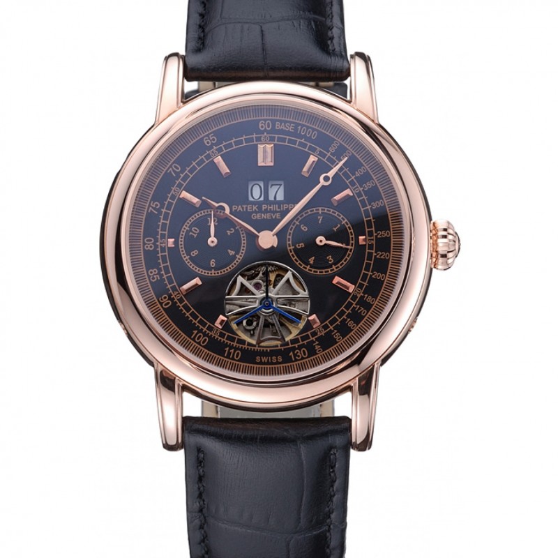 AAA Patek Philippe Geneve Complications Grand Cadran Noir Tourbillon Rose d’or Bezel bande noire 622157