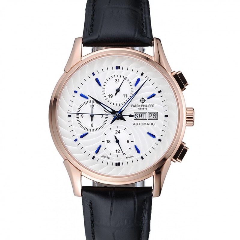 Patek Philippe Chronographe Cadran Blanc Bleu cas Mains en acier inoxydable bracelet en cuir brun