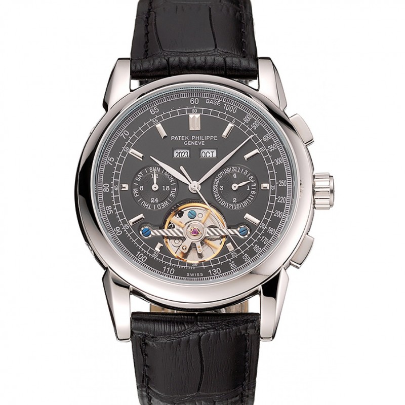 Patek Philippe Grand Complications Boîtier en acier inoxydable cadran noir en cuir noir Bracelet 622258