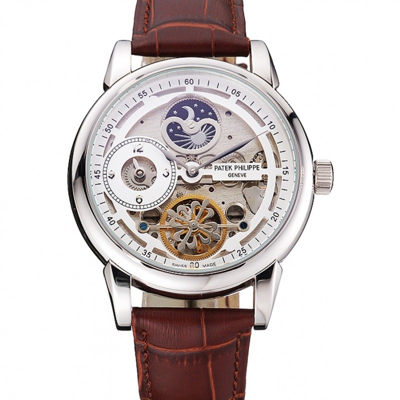 Pas Cher Replique Montre Patek Philippe Dual Time Moonphase Tourbillon Blanc squeletté Cadran Boîtier en acier inoxydable bracelet en cuir brun