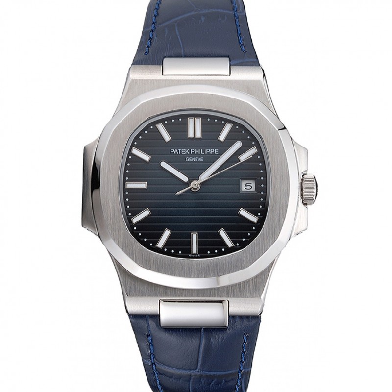 Patek Philippe Nautilus cadran bleu Boîtier en acier inoxydable Bracelet en cuir bleu