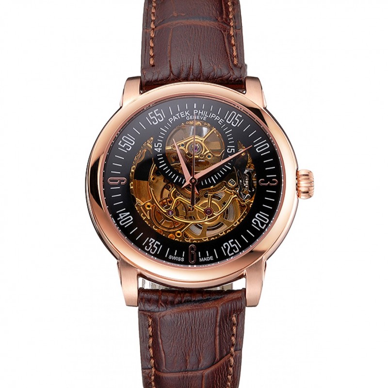 Complications suisse Patek Philippe cadran ajouré or rose bracelet en cuir brun