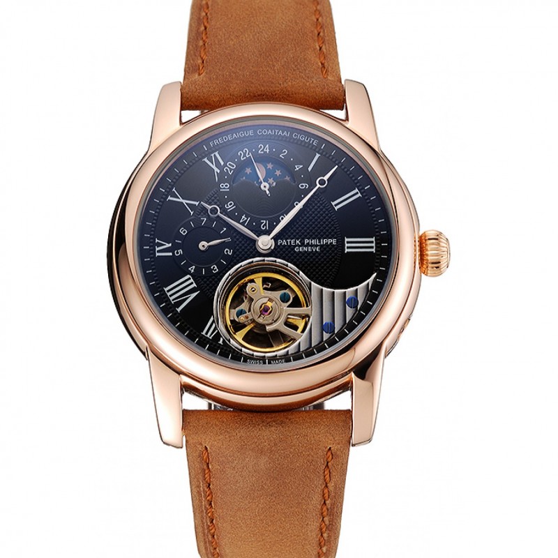 AAA Patek Philippe Grand Complications GMT Moonphase Tourbillon Cadran Noir Cas Rose Or Brown Suede Bracelet en cuir 1453821