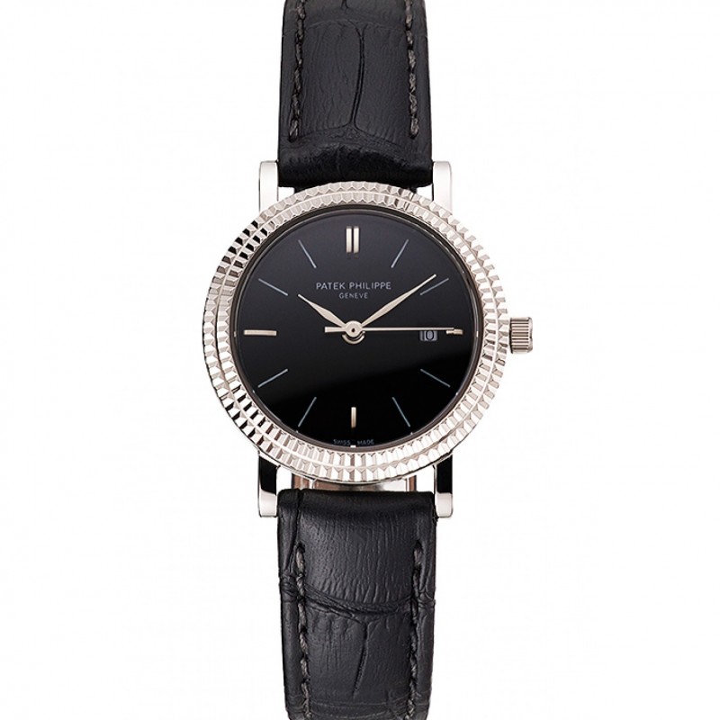 Patek Philippe Calatrava cadran noir Double nervuré Bezel Boîtier en acier inoxydable Bracelet en cuir noir