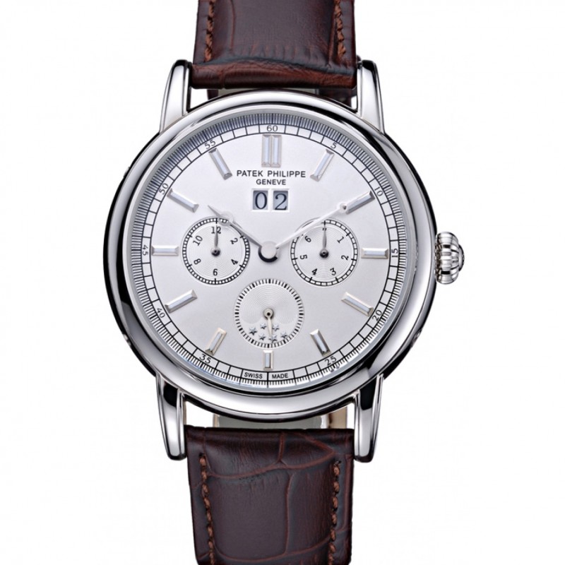 Patek Philippe Perpetual Calendar Date Rétrograde Blanc cadran argenté Marron Bracelet en cuir 1454149