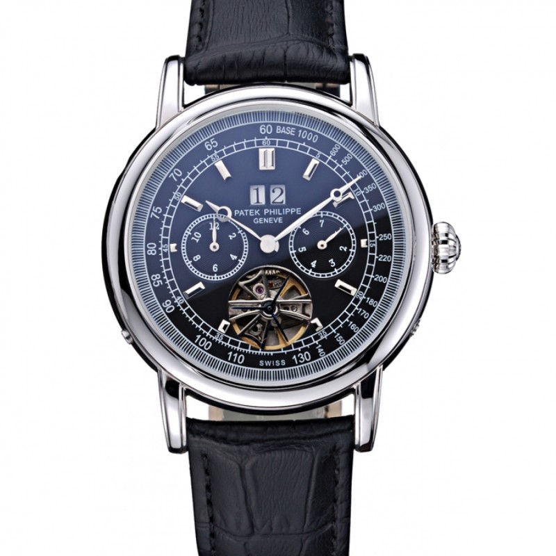 Haute qualité Replique Montre Patek Philippe Perpetual Calendar Tourbillon Cadran Noir Boîtier en acier inoxydable Bracelet en cuir noir