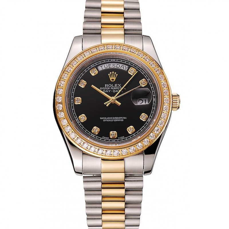 Day-Date Rolex suisse cadran noir diamant d’or Cas de deux tons Bracelet en acier inoxydable 1453975