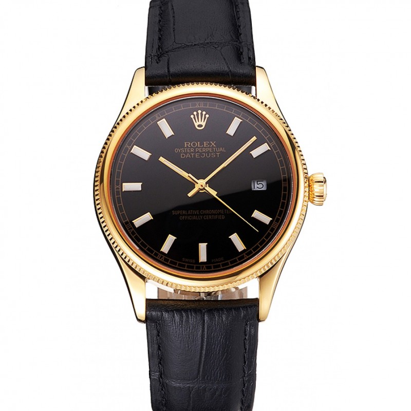 Swiss Rolex Datejust cadran noir boîtier en or Bracelet en cuir noir