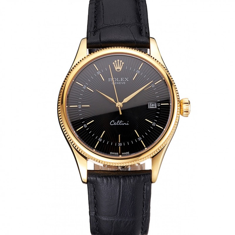 Rolex Cellini suisse Date de cadran noir boîtier en or Bracelet en cuir noir