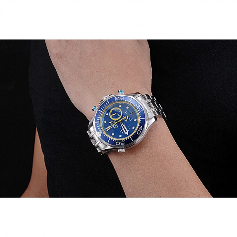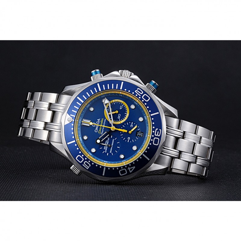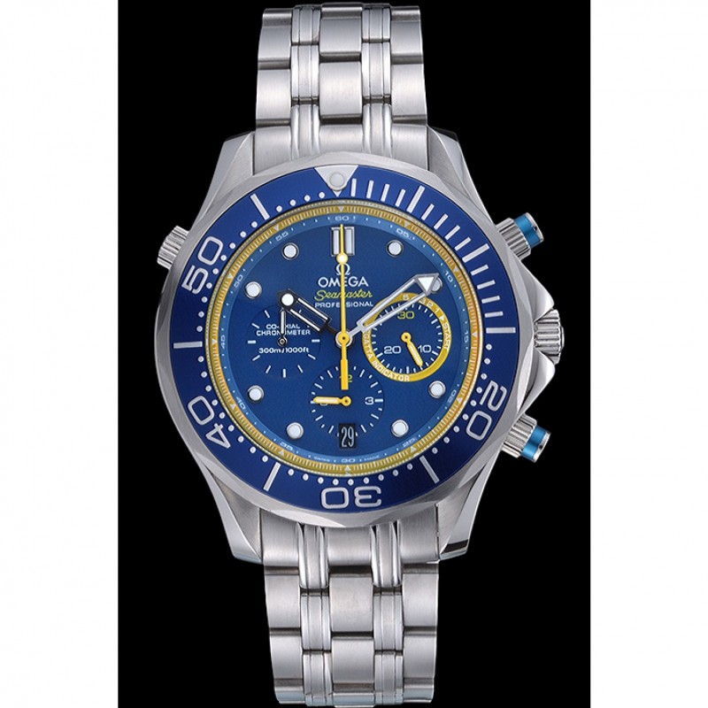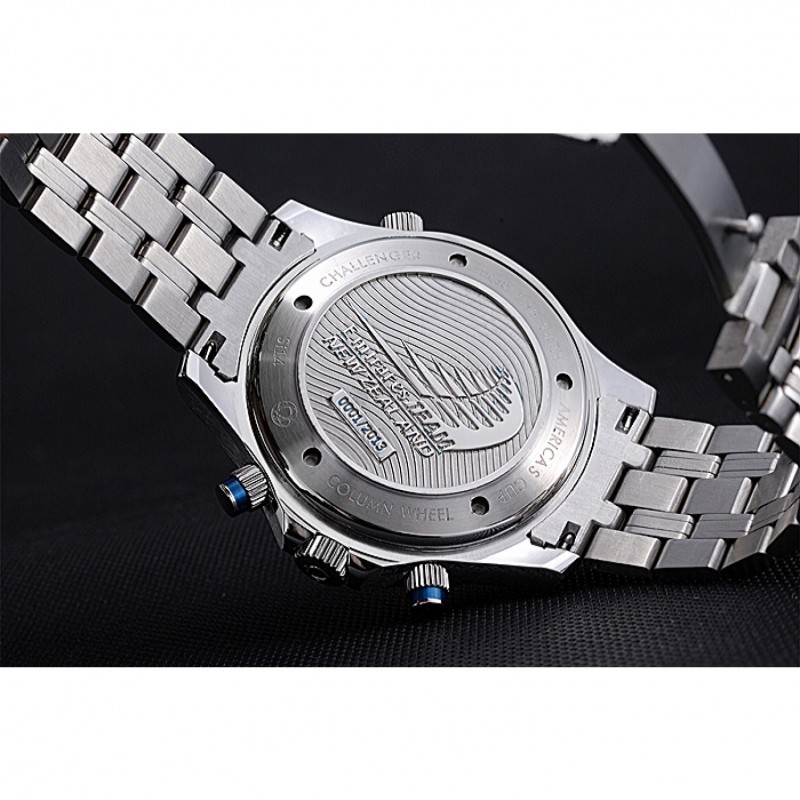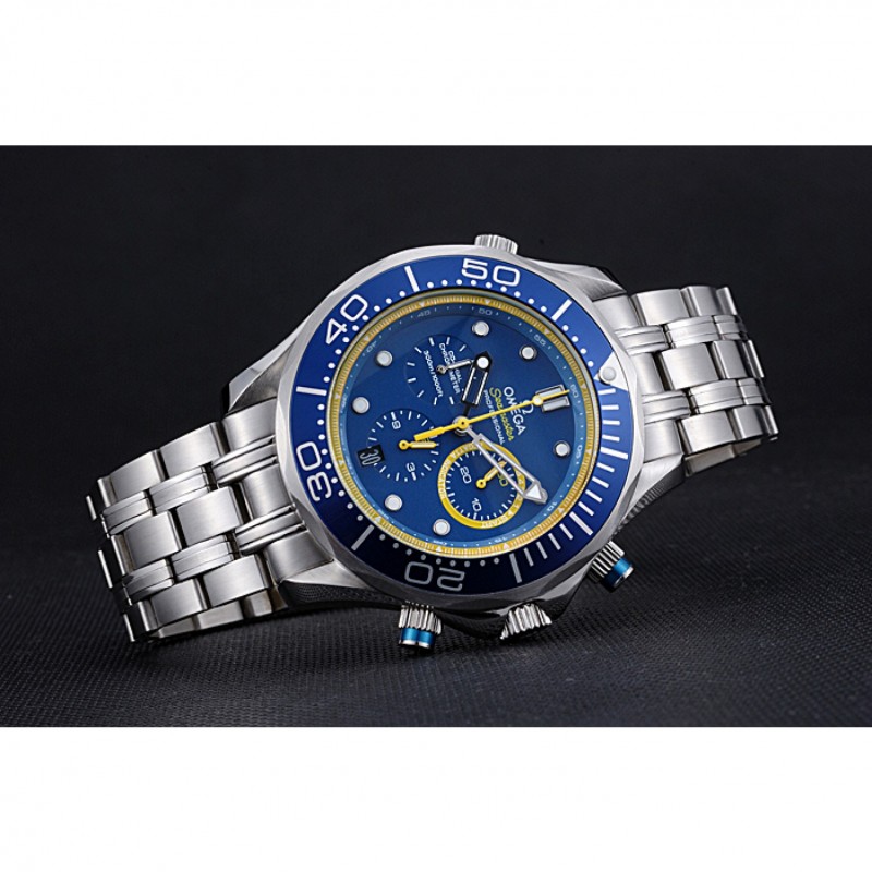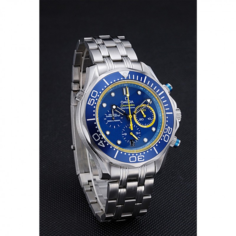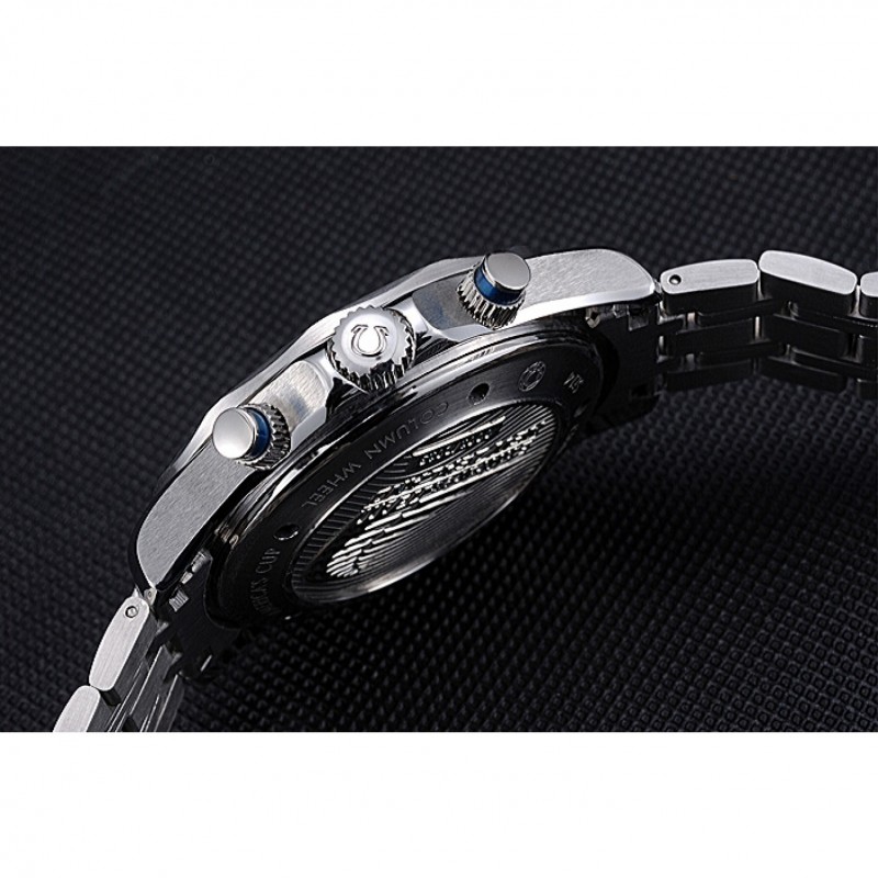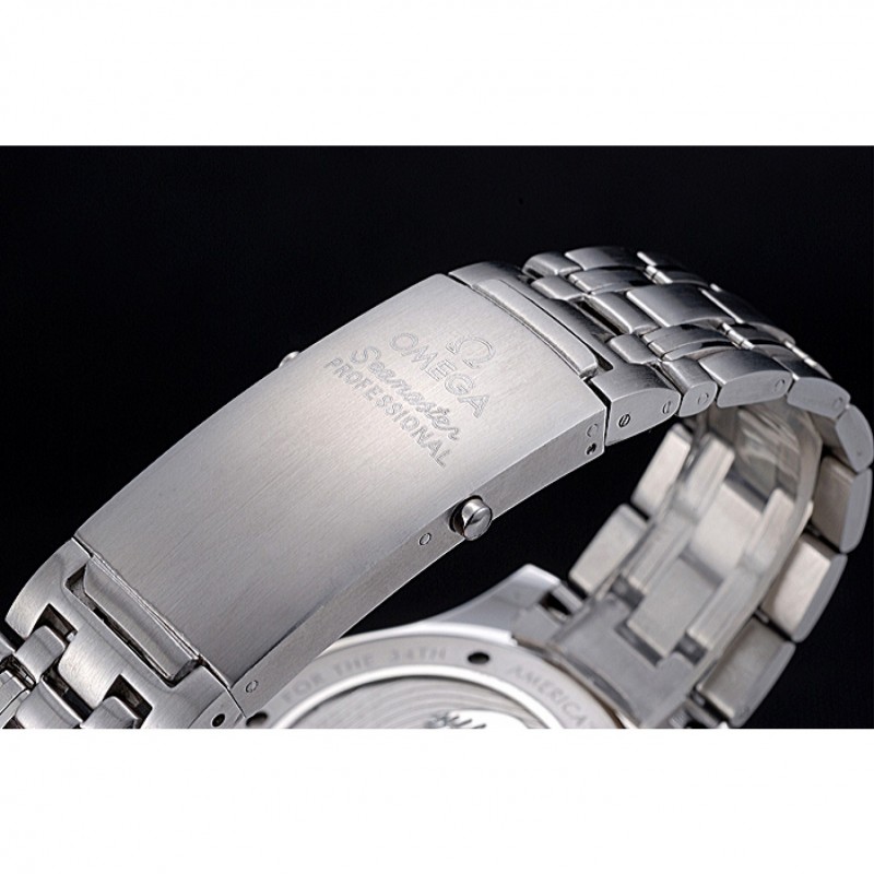 Crown :Omega logo couronne gravée en acier inoxydable poli cutwork avec bande d’émail noir bouton poussoir rond couronne de chaque côté de celui-ci ainsi qu’un logo gravé couronne en acier inoxydable cutwork brillant dans le coin supérieur opposé