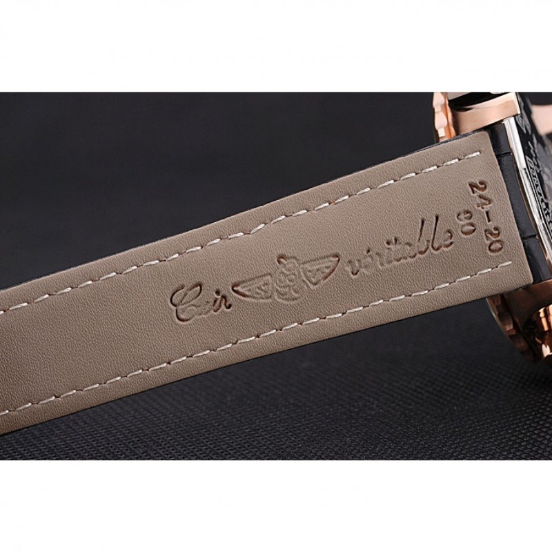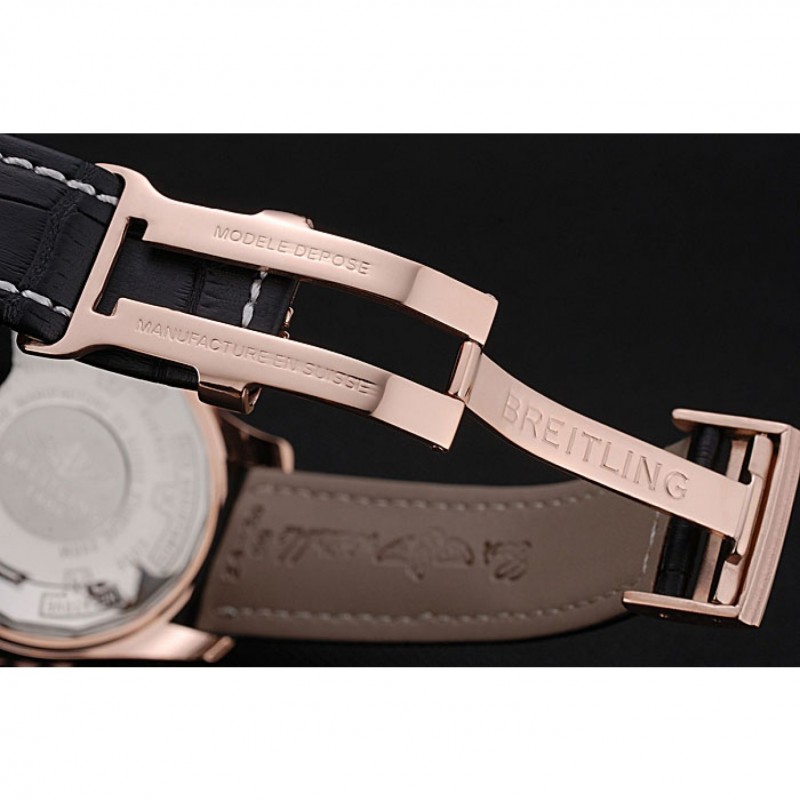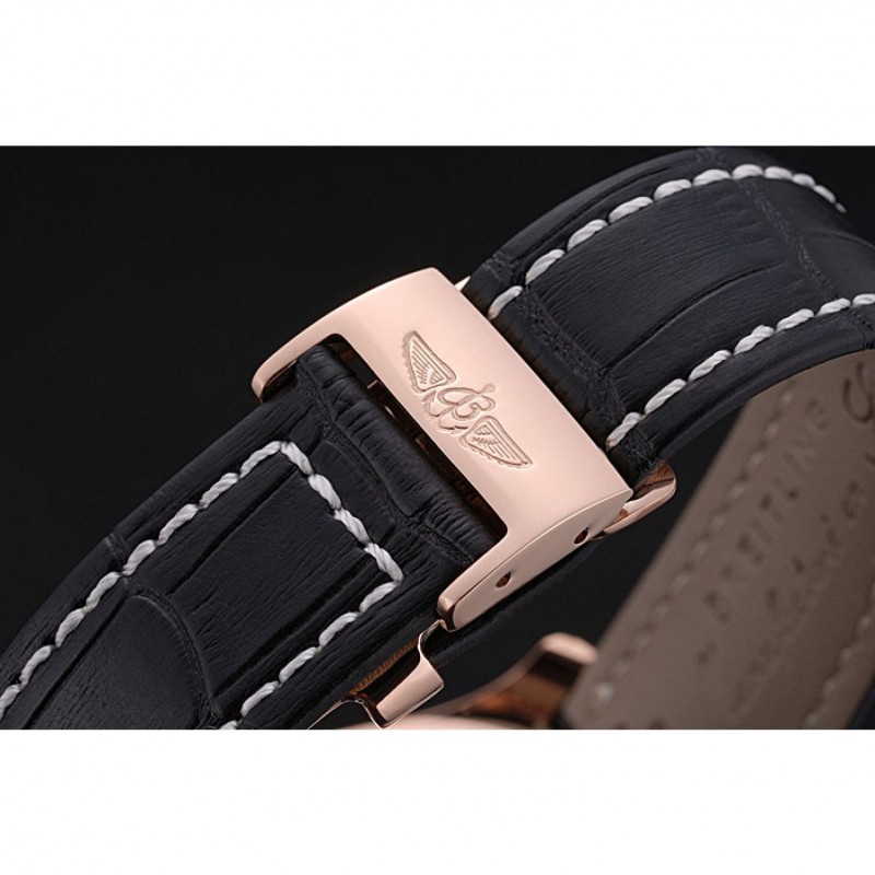 Bracelet:Heat gaufrée nom Breitling et logo crocodile noir bracelet en cuir avec coutures de fil blanc et logo gravé rose plaqué or rabattable en boucle