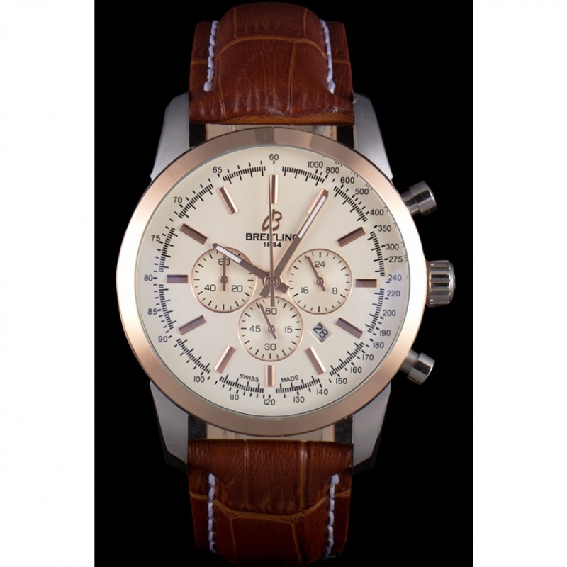 Breitling Transocean cadran blanc bracelet en cuir brun clair or rose Bezel