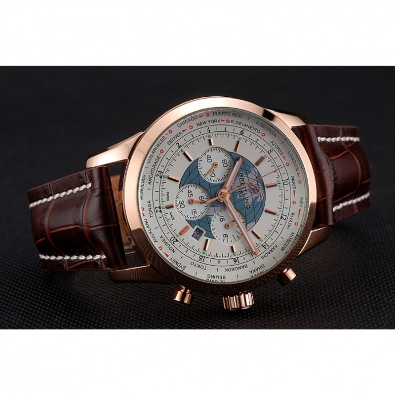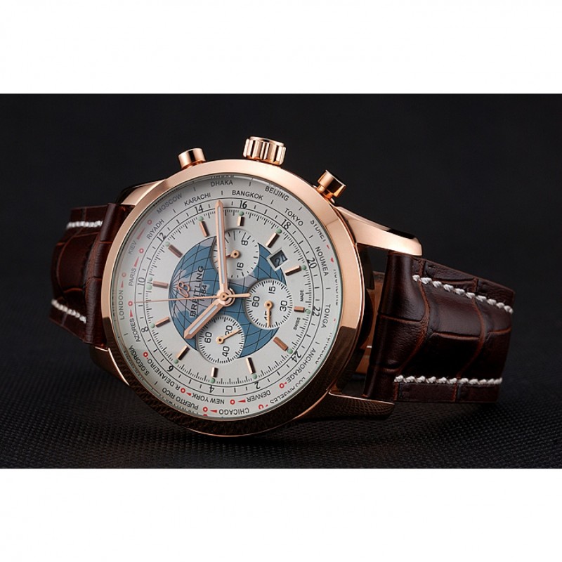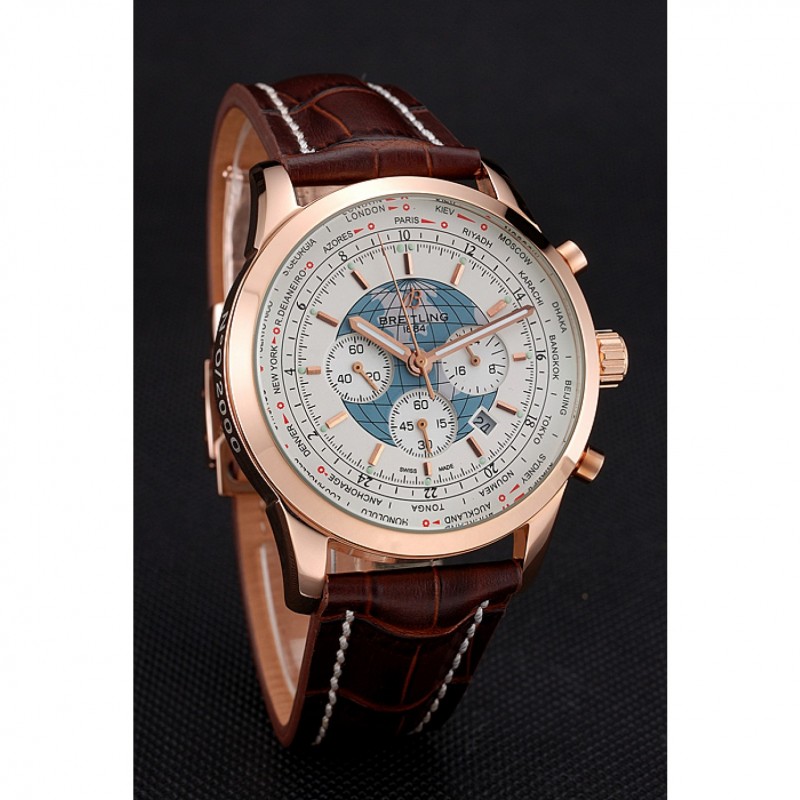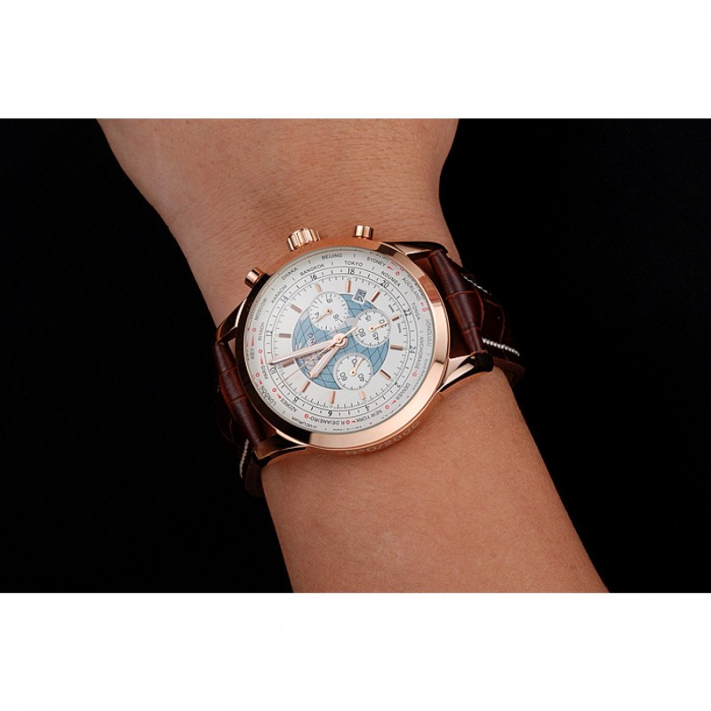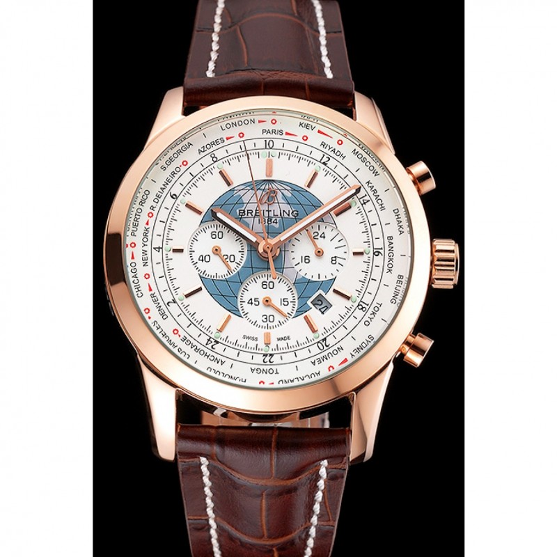 Bracelet:cuir Véritable chaleur bracelet en cuir de crocodile brun gaufré avec des coutures de fil blanc et Breitling logo 18k gravé rose plaqué or boucle déployante