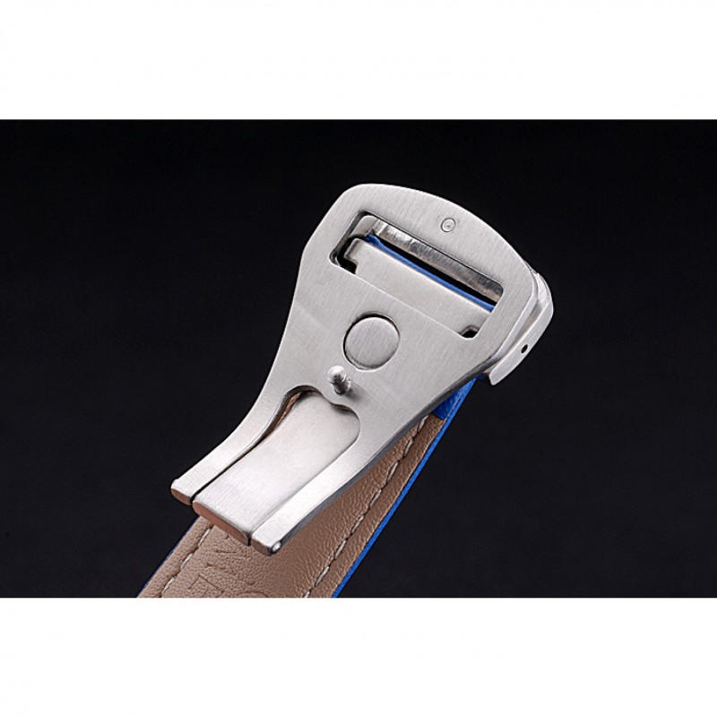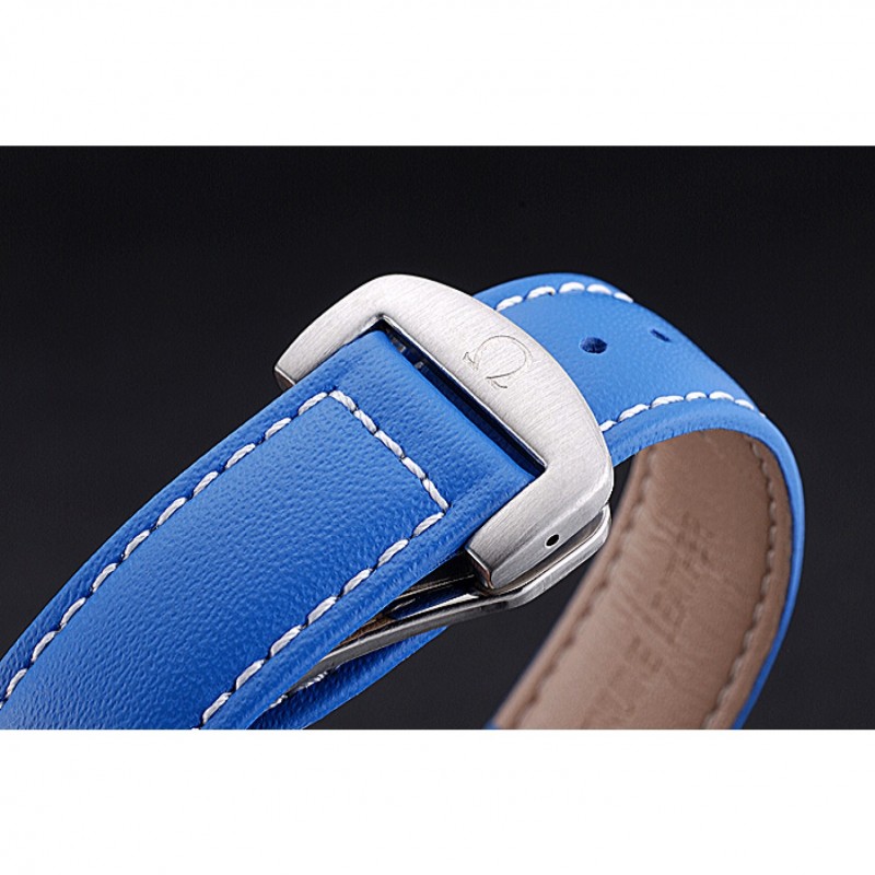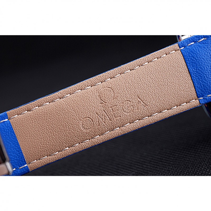 Bracelet:Omega et logo chaleur en relief bracelet en cuir bleu avec coutures fil blanc et logo Omega gravé brossé fermoir à crochet en acier inoxydable
