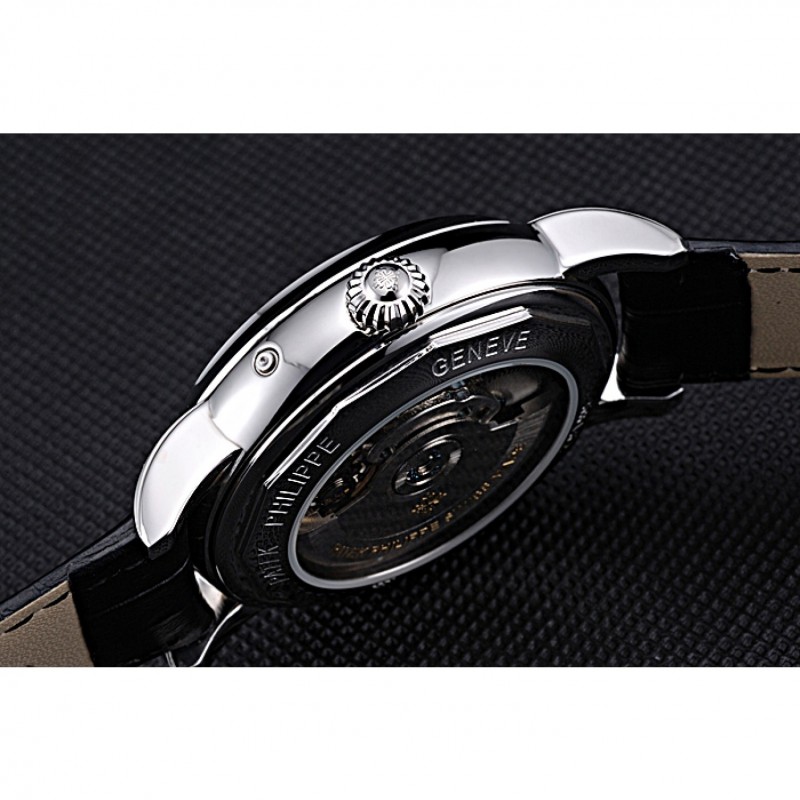 Retour:en acier inoxydable poli encliquetable à l’arrière avec la mécanique transparentes révélant centre et gravure Patek Philippe Geneve