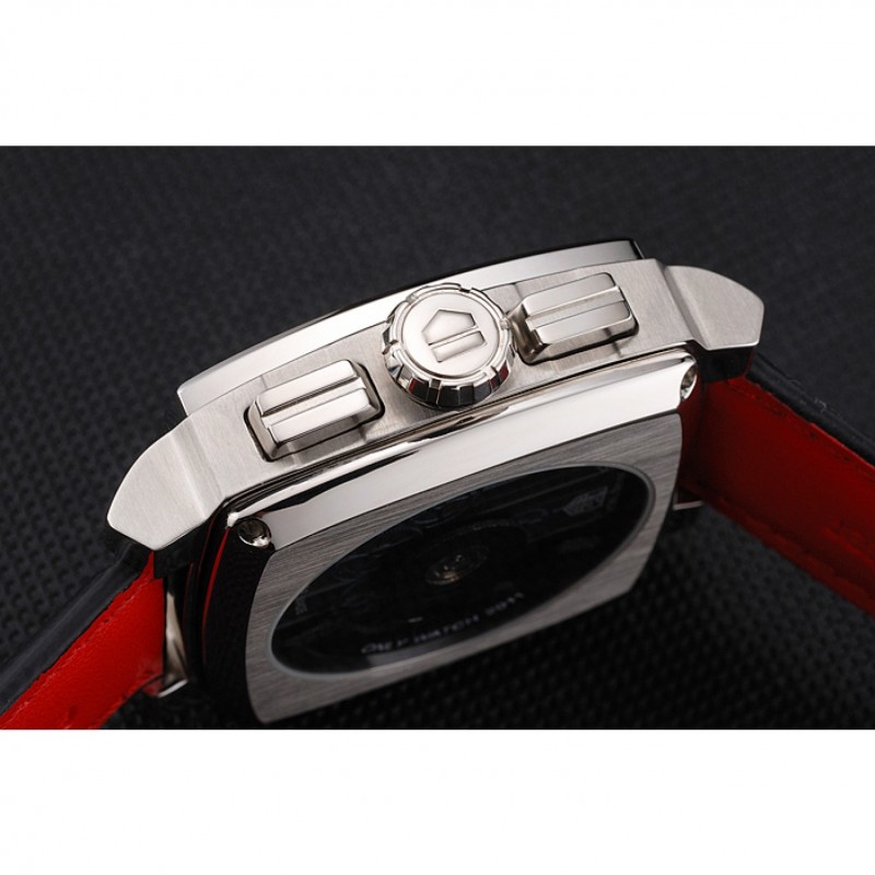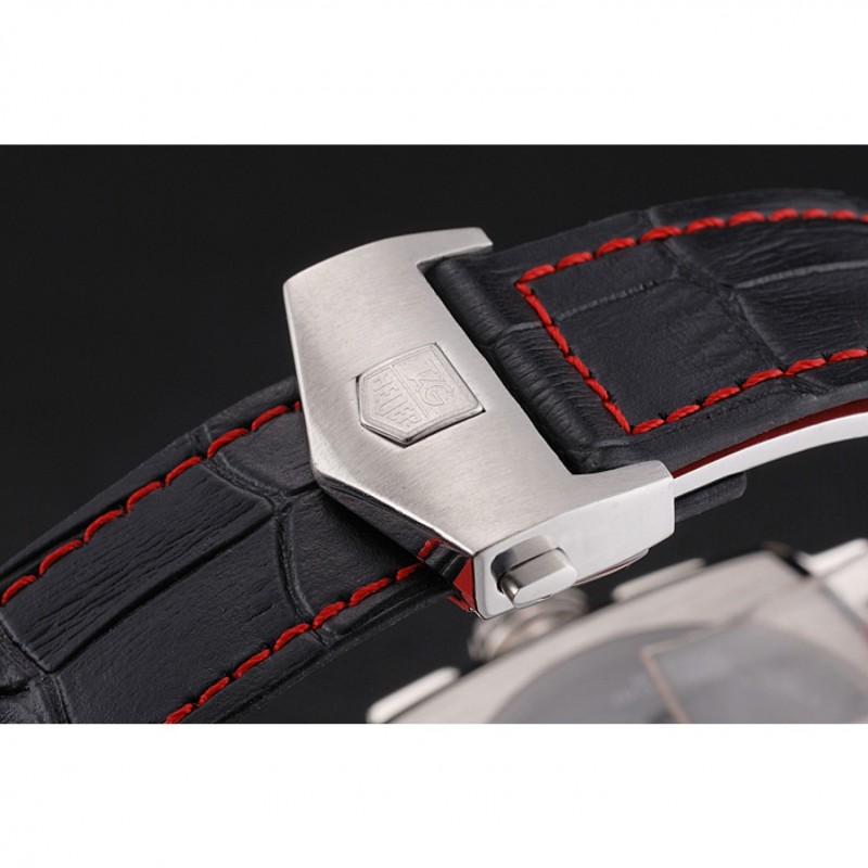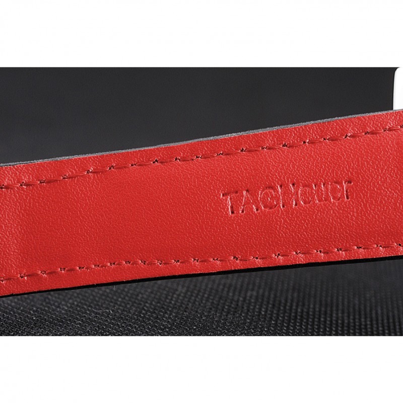 Bracelet:perforé bracelet en cuir noir rouge doublure avec Tag Heuer logo Inscribed brossé fois en boucle poussée à libération en acier inoxydable