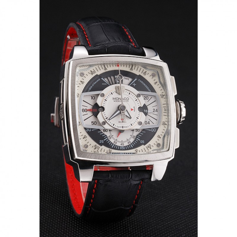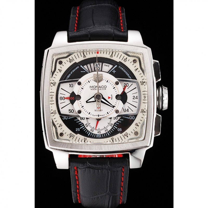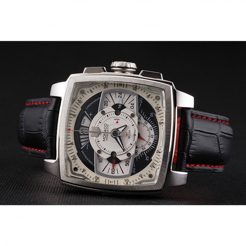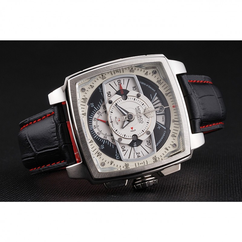 Haut Gamme Replique Montre Tag Heuer Monaco en cuir noir perforé Cadran Blanc 80306