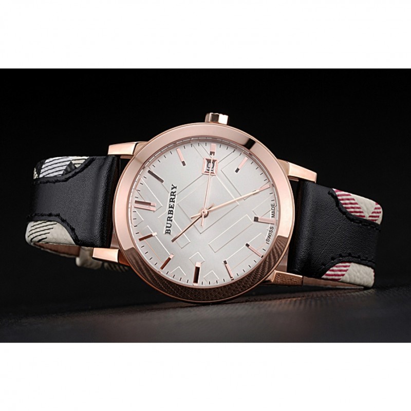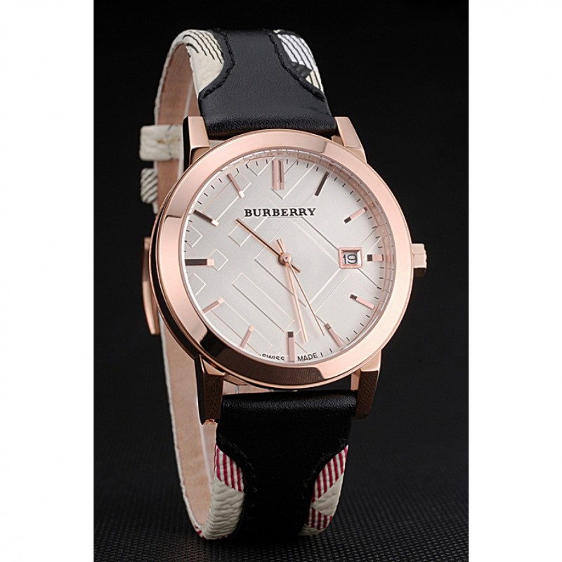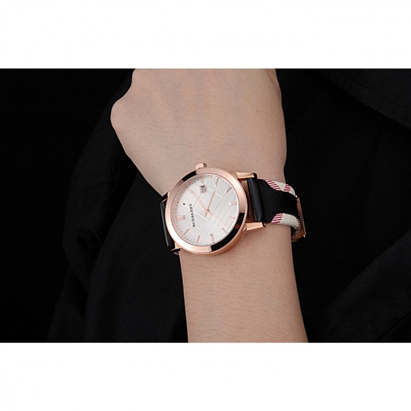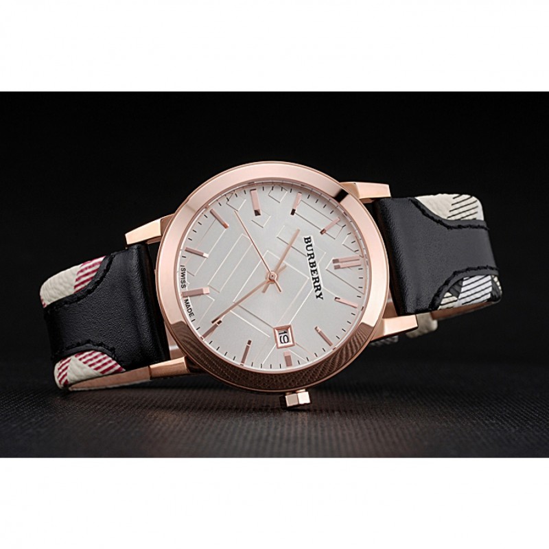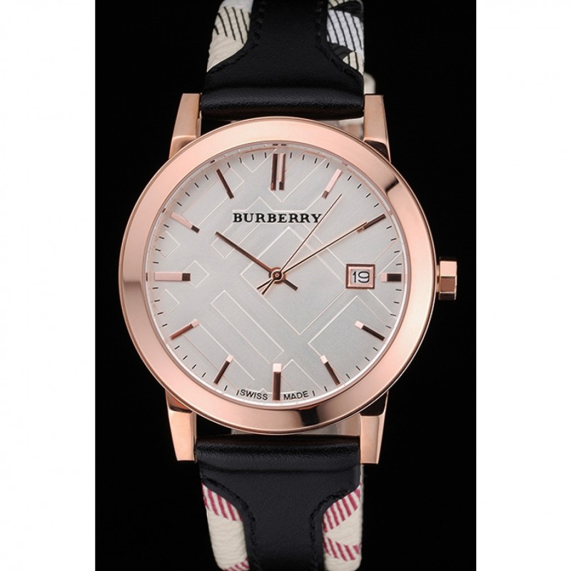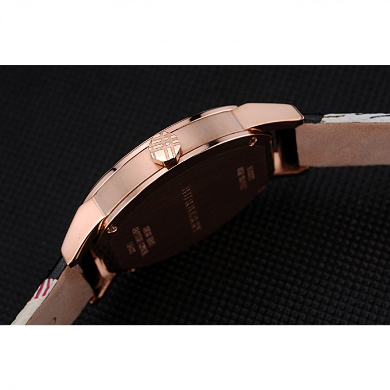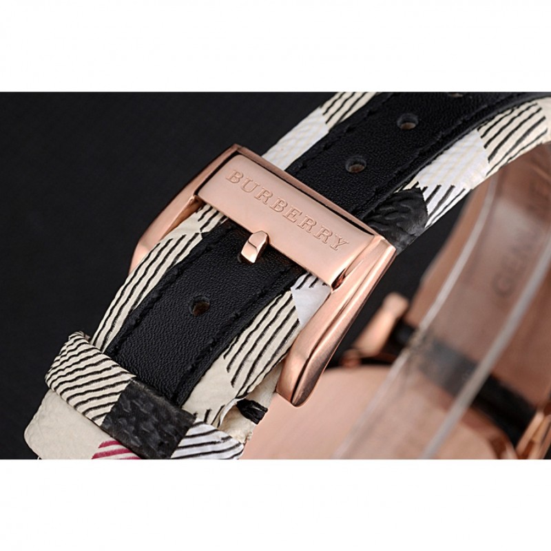 Bracelet:chaleur Burberry bracelet en cuir noir gaufré avec garniture en cuir imprimé à carreaux Burberry le long des bords et Burberry gravé 18k or rose plaqué fermoir crochet-boucle