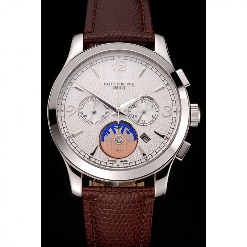 Haute qualité Patek Philippe Chronographe Blanc Cadran guilloché Boîtier en acier inoxydable bracelet en cuir brun