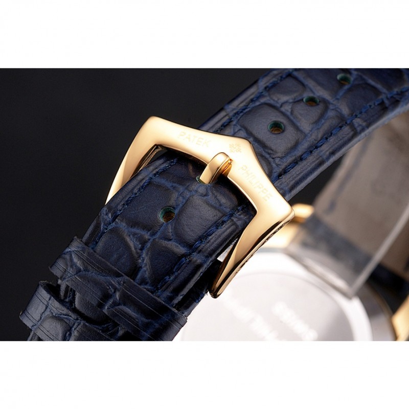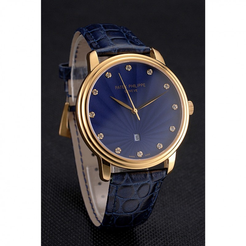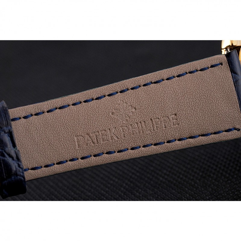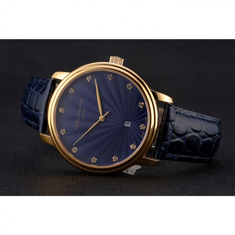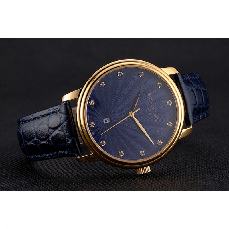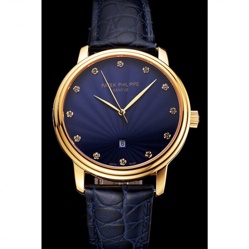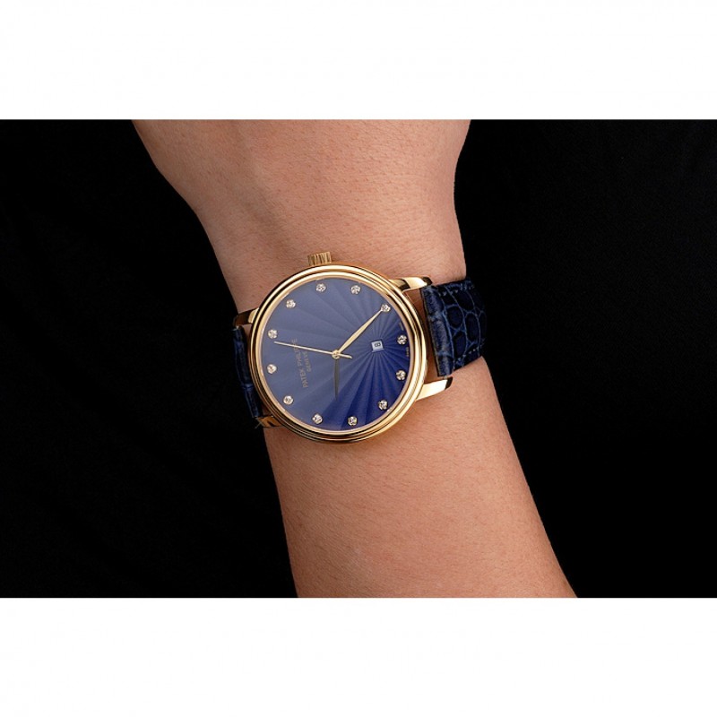 Haute qualité Replique Montre Patek Philippe Calatrava Bleu Date cadran guilloché boîtier en or bleu bracelet en cuir